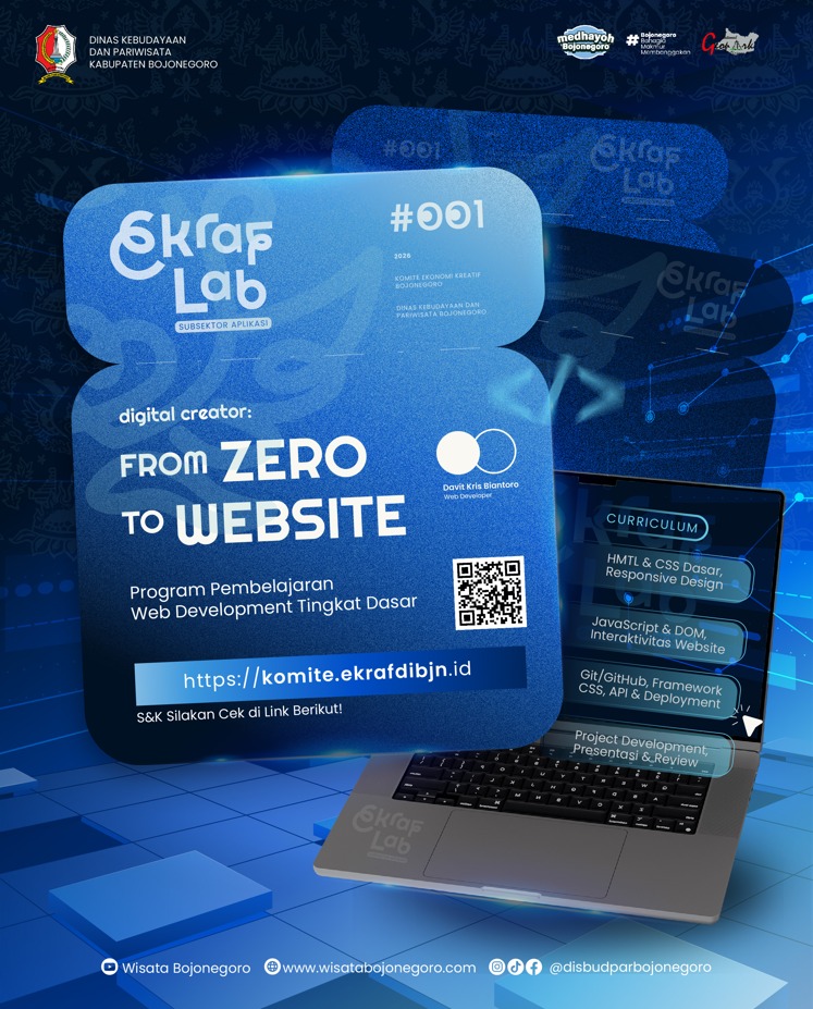 Web development class yang di selenggarakan oleh Komite Ekonomi Kreatif dan di dukung oleh Dinas Kebudayaan dan Pariwisata Kab. Bojonegoro gratis dan terbuka untuk seluruh masyarakat Bojonegoro.